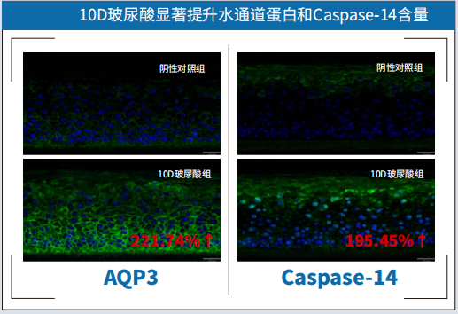 10D 玻尿酸:通过10种玻尿酸科学复配,包含大分子玻尿酸、超小分子及玻尿酸衍生成分,可以协同促进AQP3、FLG、Casepase-14等皮肤关键蛋白的表达,实现层层渗透、高效修护,充盈肌肤水循环生态系统。